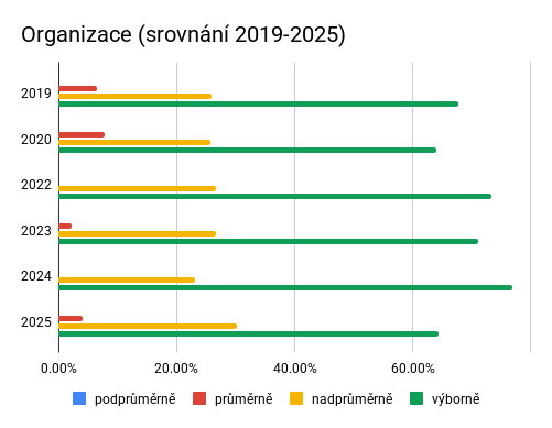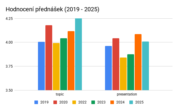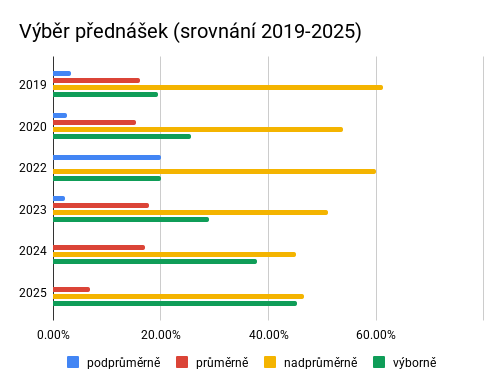 Přes mírné fluktuace mezi výborným a nadprůměrným hodnocením jsme rádi, že si i nadále držíme celkem vysoké skóre. Mírný propad v nejvyšším hodnocení přičítáme několika faktorům rozebraným níže, naopak nás těší celkově lichotivější struktura hodnocení výběru přednášek. Přičítáme to možnosti výběru z paralelních přednášek.