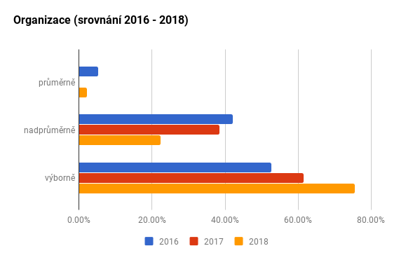 Nevím sice čím jsme si to zasloužili, ale u organizace jsme si evidentně výrazně polepšili - ten posun mezi naprůměrně a průměrně je celkem jasně viditelný. Velké díky patří všem kdo se na organizaci konference podíleli, ať už v měsících před konferencí nebo v jejím průběhu. A stejně tak díky i sponzorům, bez kterých by konference vypadala o dost jinak (a to nejenom co se cateringu týká, ale např. i zahraničních řečníků). S hodnocením přednášek je to samozřejmě o dost komplikovanější, protože to hodně závisí na tom jak se komu trefíme do jeho oblasti zájmů. Podle hodnocení to víceméně vypadá že od roku 2016 se trefujeme tak nějak pořád stejně, a asi nelze čekat nějakou úplně zásadní změnu.