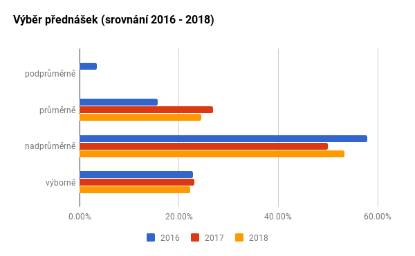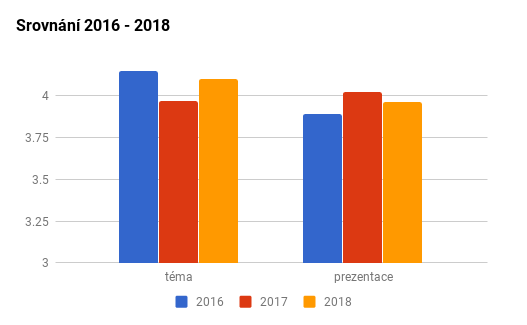 Do témat jsme se zřejmě trefili o něco lépe než v roce 2017 (ale o ždibec hůře než 2016). U kvality přednášek jsme si lehce pohoršili (ale pořád je to trochu lepší než v roce 2016). V hodnocení za rok 2015 jsem si trochu stěžoval že se nám tuto stránku konference (kvalitu přednášek) nedaří příliš zlepšovat, a jsem rád že v posledních třech ročnících se nám to celkem povedlo.