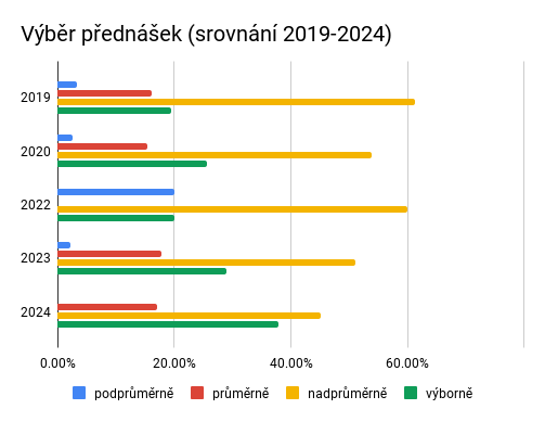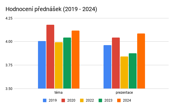 Letos jsme si bohužel v obou parametrech (výběr témat i prezentaci) polepšili, a to jak ve srovnání s předchozími dvěma ročníky, tak celkově. Co se týká témat přednášek, je to druhé nejlepší hodnocení za dobu trvání konference (po roce 2020), v prezentaci dokonce historicky nejlepší hodnocení.