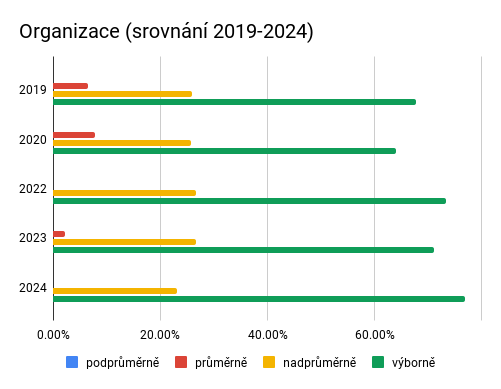 U organizace si dlouhodobě držíme celkem dobré hodnocení - součet nadprůměrných a výborných hodnocení se dlouhodobě pohybuje někde okolo 95%, a to se těžko překonává. V grafech se to samozřejmě mezi lety lehce mění, ale to je do velké míry šum a souhra náhod na které ani nemáme přímý vliv. To nás jako organizátory samozřejmě velmi těší, byť není jednoduché tuto úroveň udržet a je otázka co se stane až se něco skutečně pokazí (v tomto ohledu jsme zatím měli dost štěstí). Současně bude velice obtížné tuto úroveň udržet pokud bychom se rozhodli nějak upravit formát konference (např. víc paralelních tracků nebo dní), protože čím více pohyblivých částí do sebe musí zapadat, tím obtížnější koordinace.